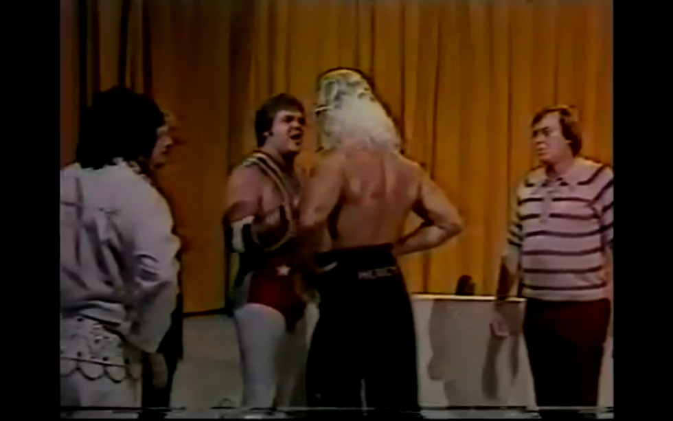 Hope and Davis are already in the ring as Ferris and Valiant come out, with Valiant and Davis starting. Jimmy has control in the first few moments as he also tags in Ferris. And if Wayve Ferris looks familiar, he would go on to the WWF as The Honky Tonk Man! Ferris and Valiant do a good job keeping Davis horizontal as they cut the ring in half. After a few minutes, Ferris misses an elbow as Danny takes over with a few blows of his own.